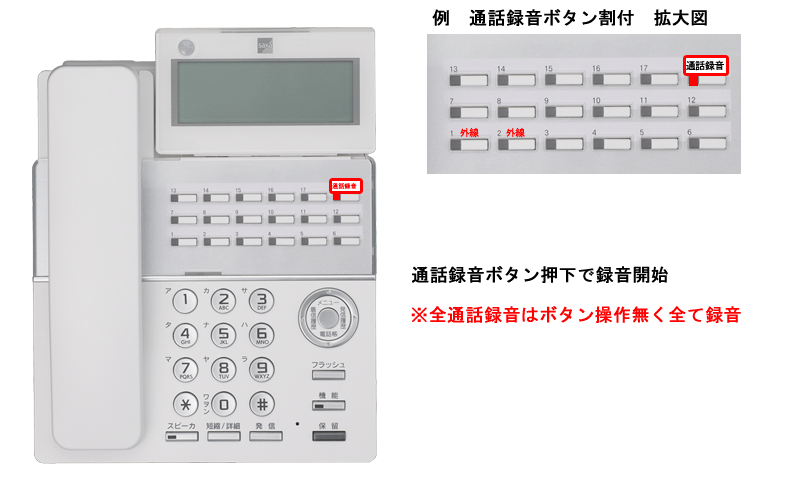ビジネスフォン主装置側で、「通話が始まると自動的に録音開始」、通話中に通話録音のボタンが押されなければ「通話録音内容は自動的に消去」されます。
