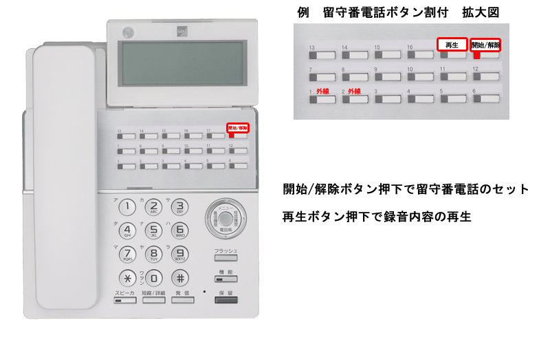 REC電話機の場合は、電話機本体に留守番電話機能が搭載されており、1つの電話機で開始、解除、再生となる為、該当電話機1台で運用します。